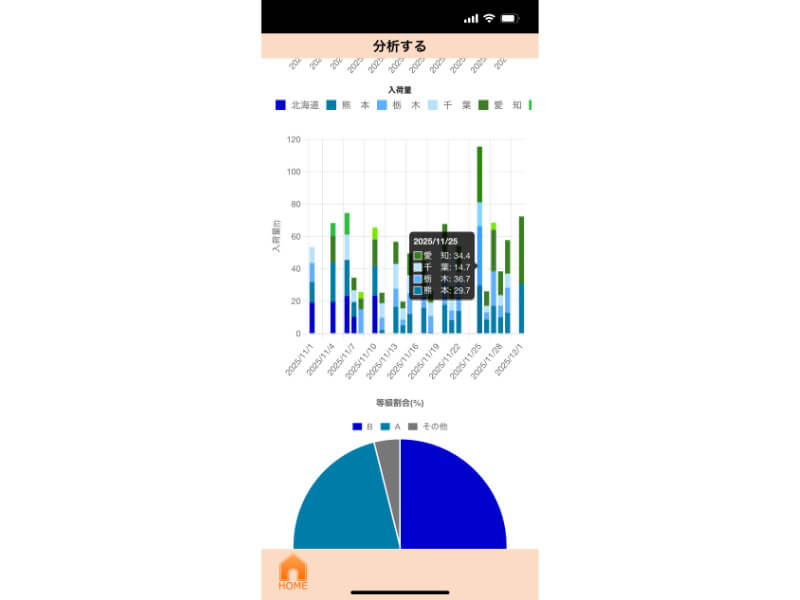 市場における青果物の価格と入荷量に産地情報をかけ合わせたデータと、等階級に関するデータをグラフで表示。競合する産地からの入荷量、市場に出回る品質を確認することで、市場の動向(トレンド)を読み取れる。