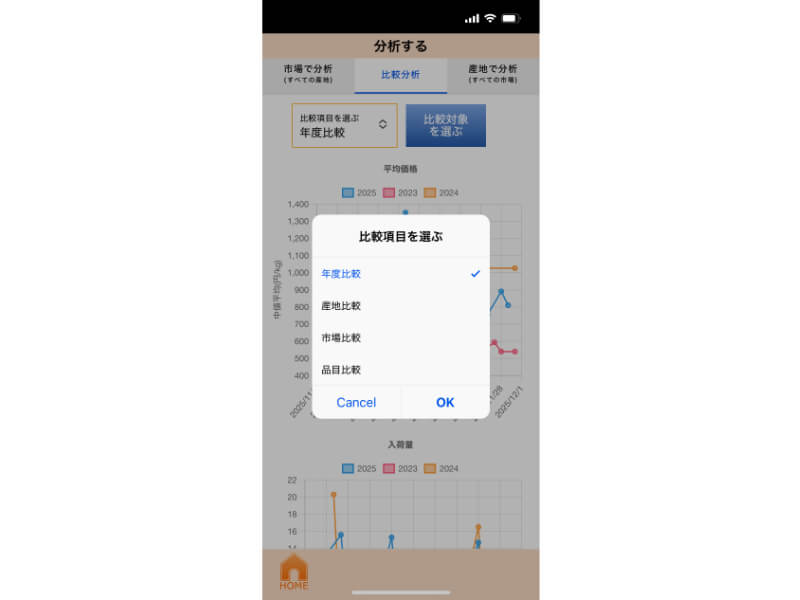 そう考える川島さんに寄り添うのが、新機能の「市況分析」だ。当機能では、異なる品目の価格や入荷量のデータを一括で表示し、それらの動向の比較もできる。ここで得られるデータや動向は、ブドウの需要が増減する時期を予測するうえでも役に立つ。