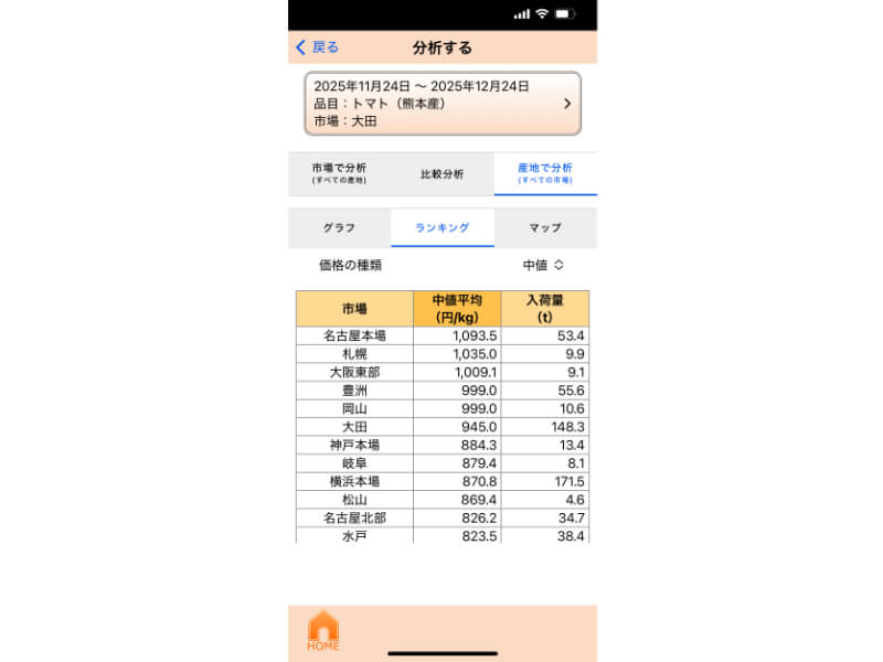 価格/入荷量に基づき、全国の市場や産地がランキング形式で示される。