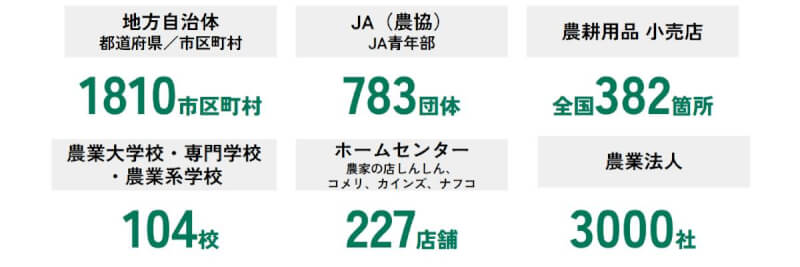 ● 主な配布先:地方自治体、JA(農協)、ホームセンター、農業法人、ホームセンター、展示会 など