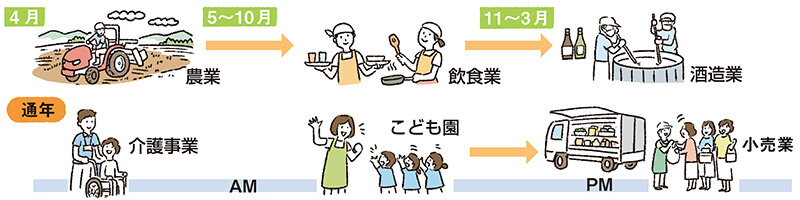 特定地域づくり事業協同組合で雇用された職員は、組合員の事業所に期間を区切って派遣される。例えば、春から初夏は農業、秋は飲食業、冬は酒造業を、といったふうに1年の間に複数の仕事を経験するケースがある。