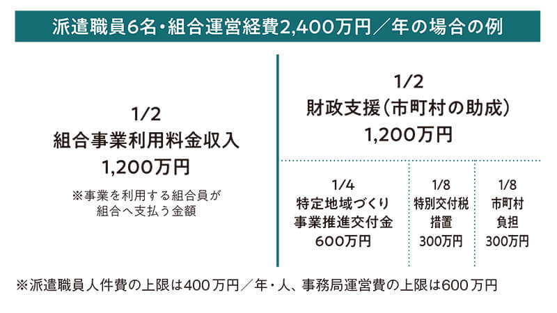 例えば、年間の職員の人件費が1800万円、事務局運営費は600万円で、支出合計が2400万円の組合に対しては、年間1200万円の交付金が交付される。また、職員の派遣を通し、組合は利用料を収入として得られる。組合員からの利用料と交付金を活用し、収支の均衡を目指すことができる。
