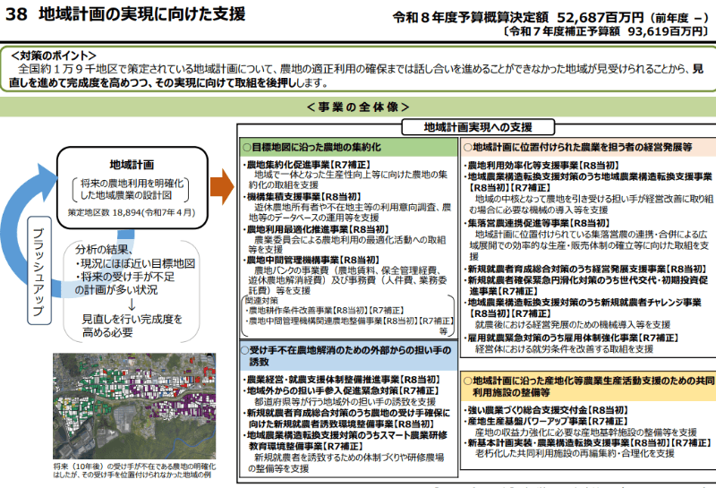 全国約1万9000地区で策定されている地域計画について、農地の適正利用の確保まで話し合いを進めることができなかった地域が見受けられることから、見直しを進めて完成度を高めるよう、その実現に向けて農地の集約化や地域外からの担い手誘致、人材育成、施設整備などの取り組みを後押しする。