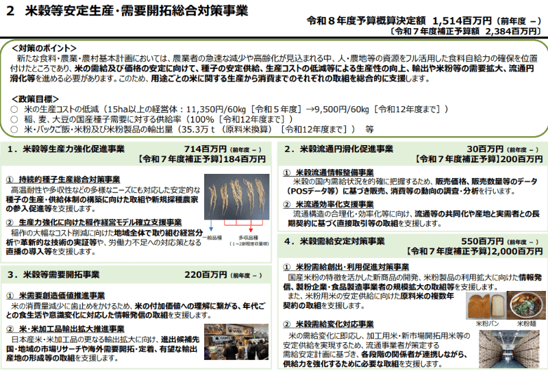 また、稲作の大幅なコスト削減に向けた地域全体で取り組む経営分析や革新的な技術の実証、労働力不足への対応策となる節水型乾田直播の導入などを支援する。さらに米・米加工品の輸出拡大に向け、進出候補先となる国・地域の市場リサーチや海外需要開拓・定着、有望な輸出産地の形成などの取り組みを支援する。