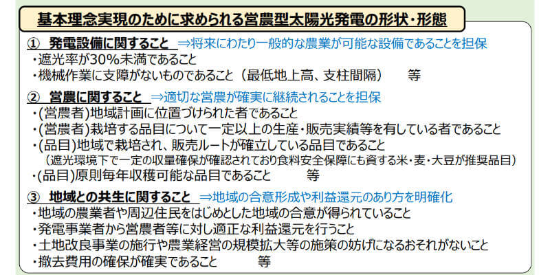 このうち、「発電設備の形状」については、将来にわたって機械作業を含む一般的な農業が継続できる設備であることを求めている。具体的には、遮光率が30%未満であること、適切な日射量を確保し、収量減少を防ぐこと、作業性を確保するため、最低地上高や支柱間隔が、農機具の作業に支障ない構造であることを挙げた。