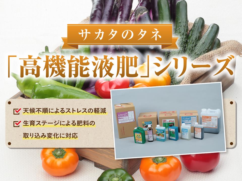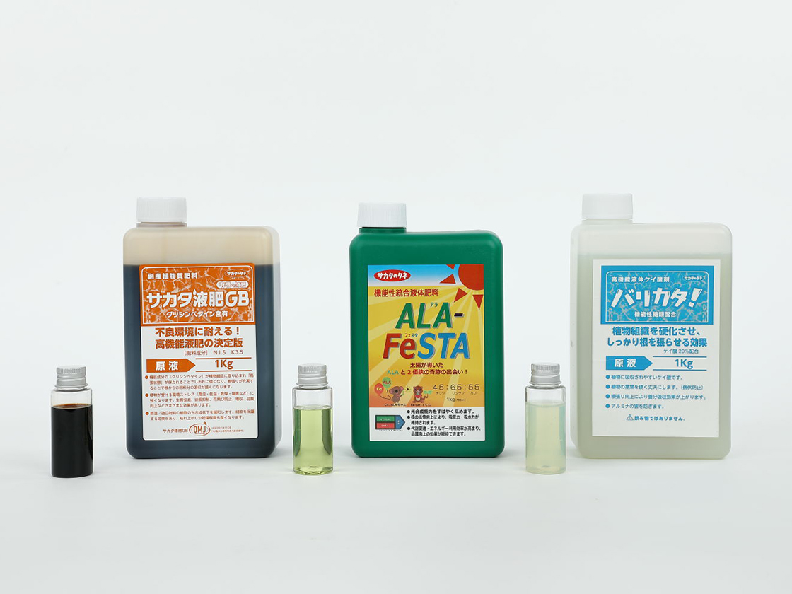 弊社高機能液肥シリーズは用途別に豊富なラインナップをそろえ、健康な苗づくりや定植時のストレス軽減、台風・高温・低温・乾燥・低日照等の環境への対応、収量や品質への付加価値など様々な場面でご使用いただいております。特に昨今の天候不順により、「ALA-FeSTA」、「サカタ液肥GB」、「バリカタ」などの光合成促進・ストレス軽減・強い植物体づくりに効果のある液肥のお問合せが多くなっています。