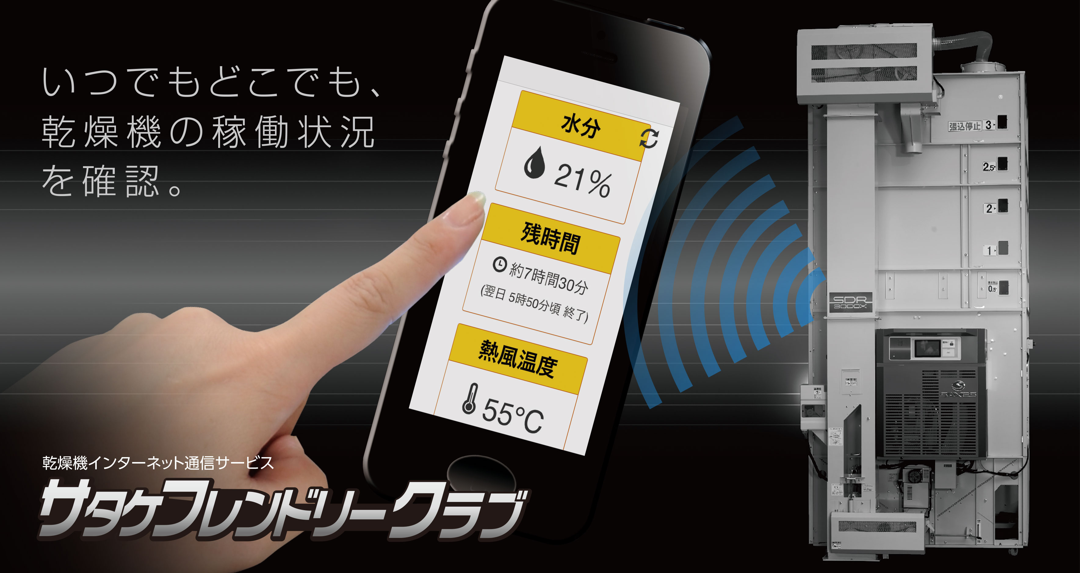 サタケフレンドリークラブへの入会によりスマートフォン・タブレット・PCなどの端末から、熱風温度や乾燥予定時刻など現在の運転状況、乾燥速度や仕上水分など設定状況の確認をすることができます。また、乾燥終了時やエラーが発生した時にメールでお知らせを受け取ることも可能です。