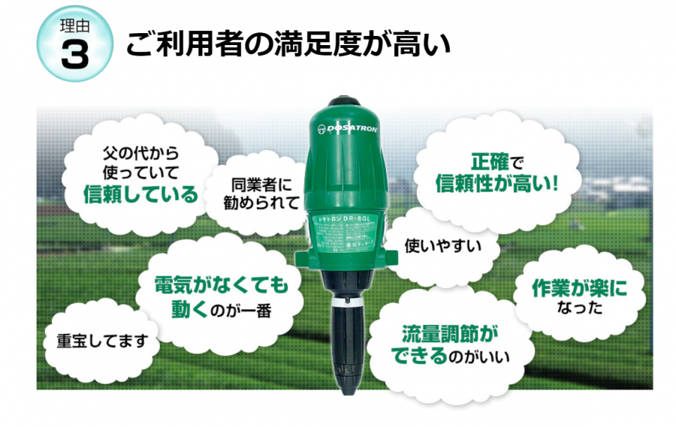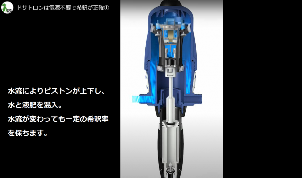 水流で動くので電源不要!正確な希釈精度でメンテナンスも簡単。ドサトロンは養液栽培に最適です。