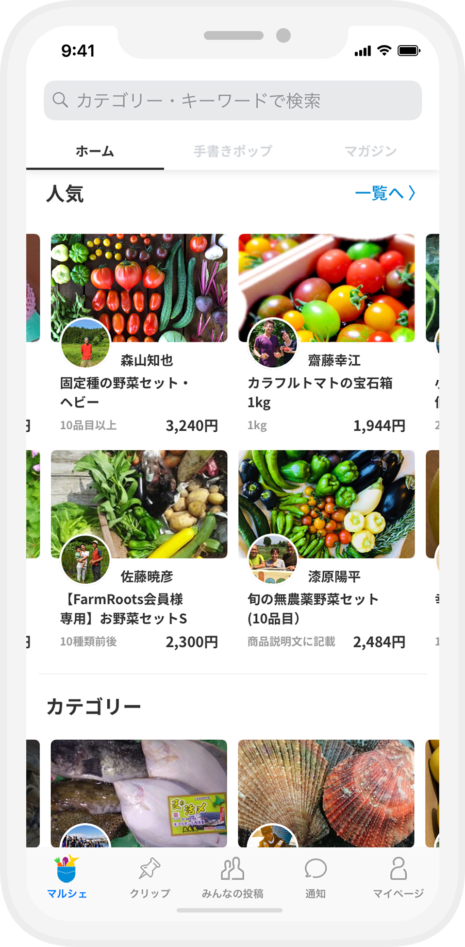 ポケットマルシェは、生産者と消費者をつなぐオンラインマルシェです。生産者が誰でも簡単に出品できる仕組みをつくりました。