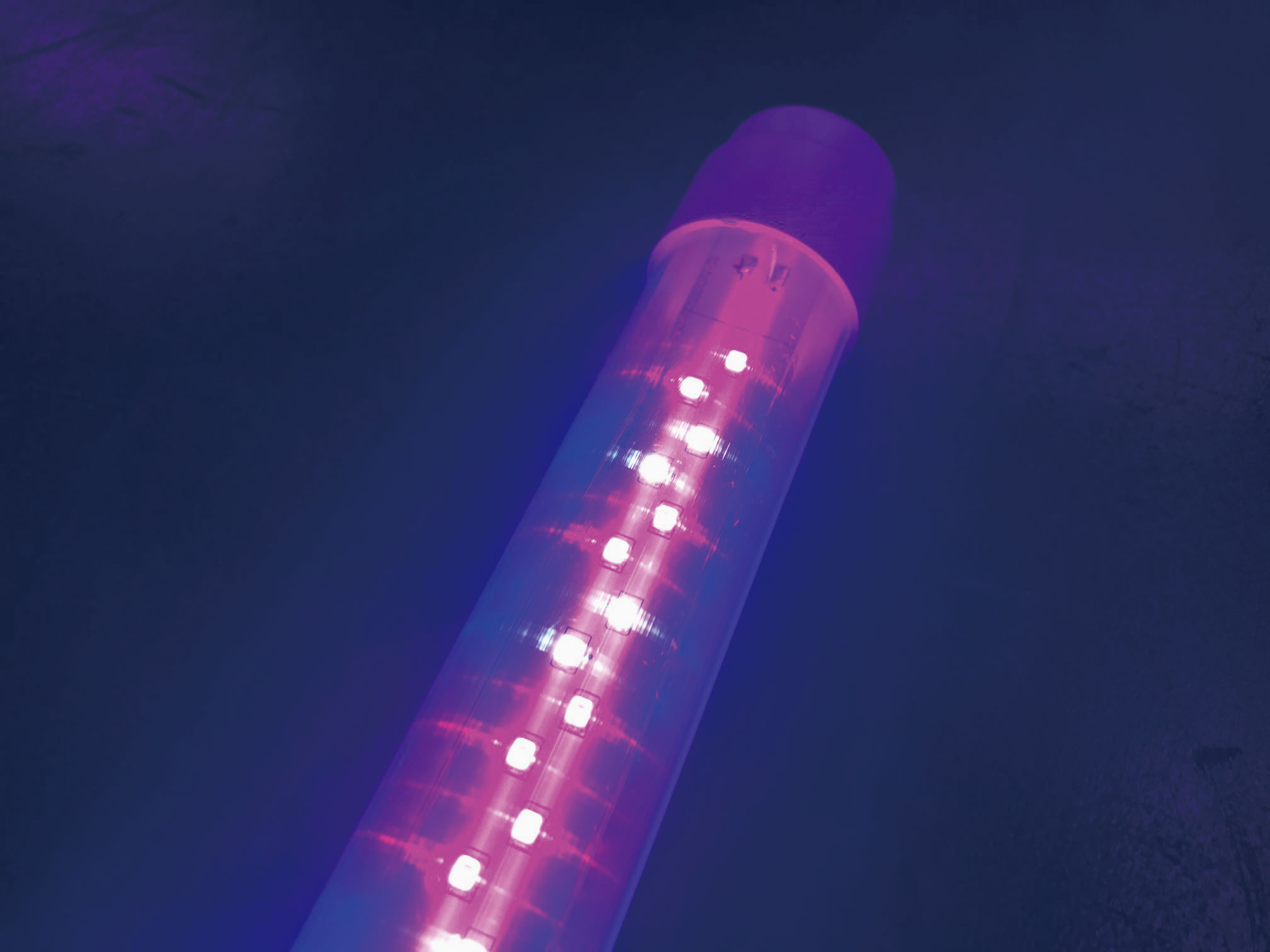 「下面高出力タイプ 電球型防病用 UV-B LED」は今夏に販売開始した、日本初の電球型のUV-B LED。電球型のため強力に広い範囲を照射できます。農業現場でも故障なく使えるよう、完全防水に加え特殊樹脂材で割れにくい安全設計です。