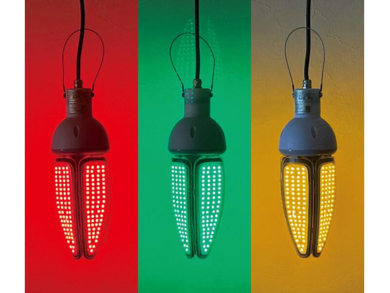 施設園芸の圃場内に侵入し病気や生理障害の原因となる虫の侵入や活動を抑制する防虫LEDです。アザミウマと呼ばれるスリップス類、夜蛾、ヨトウムシなどそれぞれに効果のある赤、緑、黄色の3色をラインナップ。赤色波長(630mm)内のアザミウマ類は飛翔できなくなり、作物の緑色を識別することも困難になります。吊り下げるだけの簡単設置で、AC100V-200Vで使用可能、完全防水仕様です。