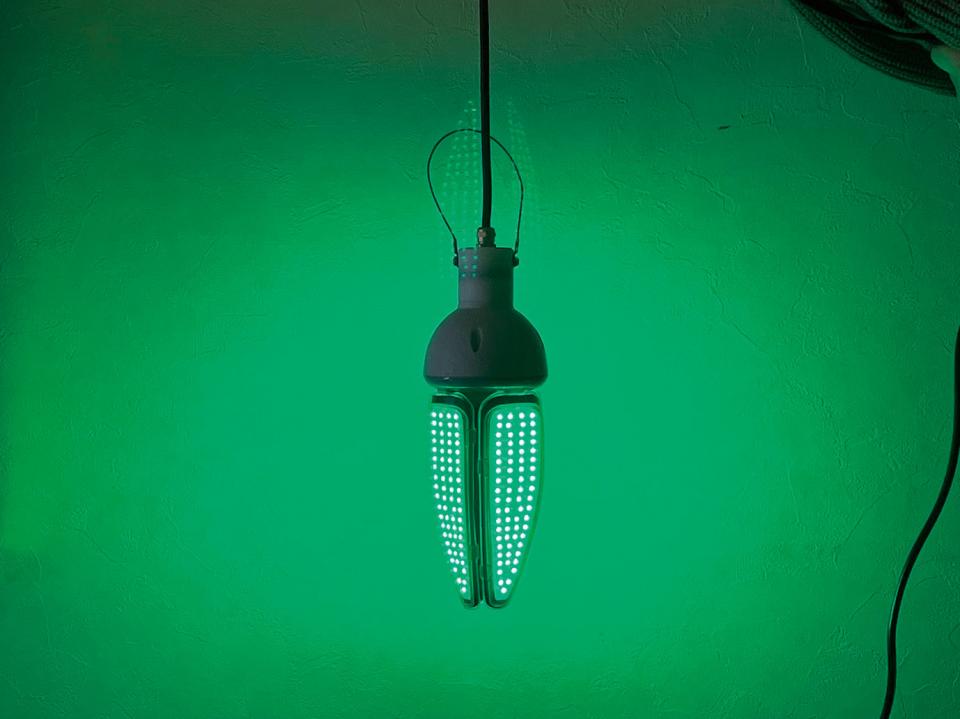 「下面高出力タイプ 電球型防病用 UV-B LED」は今夏に販売開始した、日本初の電球型のUV-B LED。電球型のため強力に広い範囲を照射できます。農業現場でも故障なく使えるよう、完全防水に加え特殊樹脂材で割れにくい安全設計です。
