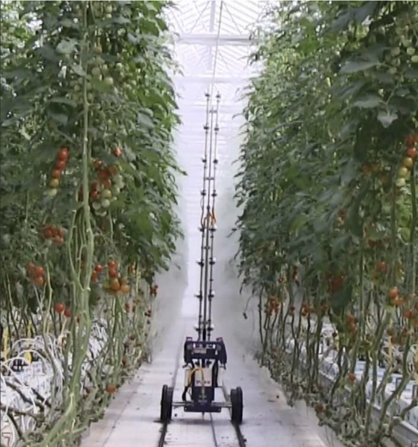 静電ノズル標準装備。ハウス内のレール上をスイッチONで無人走行、防除時間短縮、外側の自由輪で移動もラクラク、 女性でも簡単!