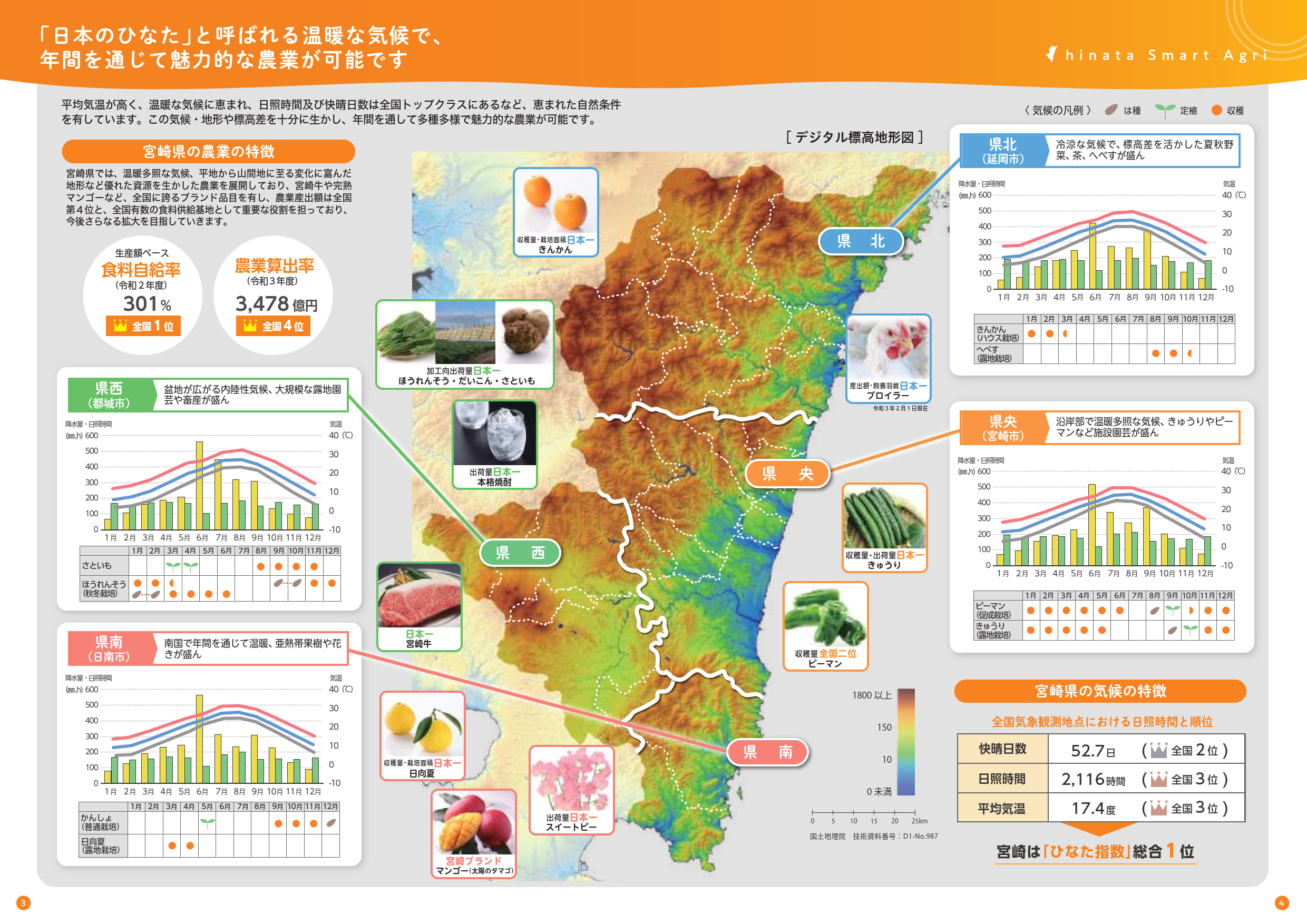 宮崎県は平均気温、日照時間、快晴日数がすべて国内トップクラスで、「日本のひなた」のキャッチフレーズに象徴される、明るく温暖な気候は豊かな農産物を育むことができる環境です。