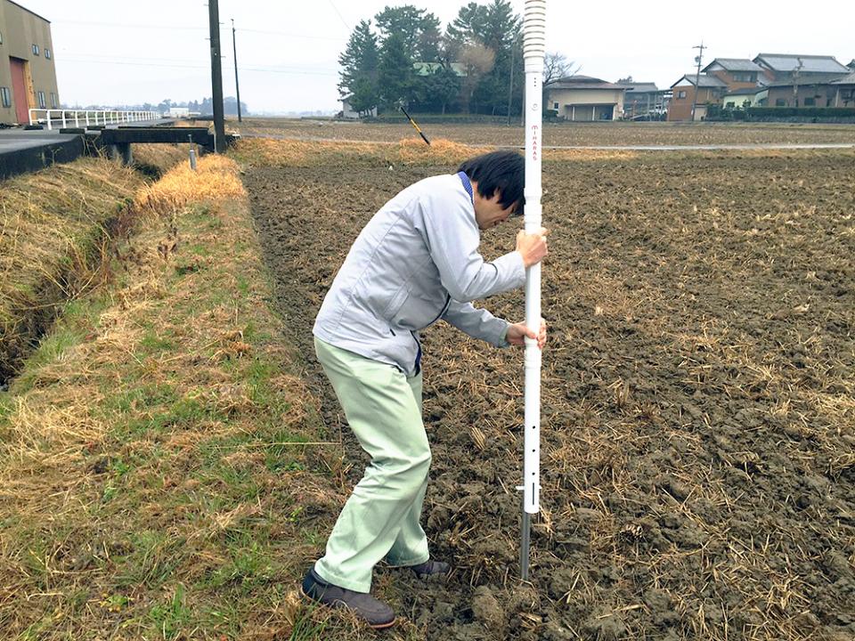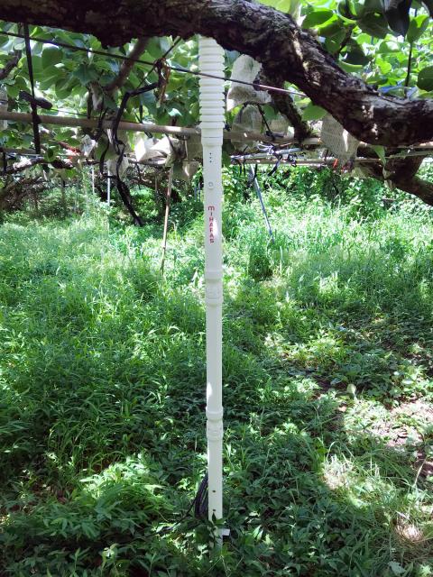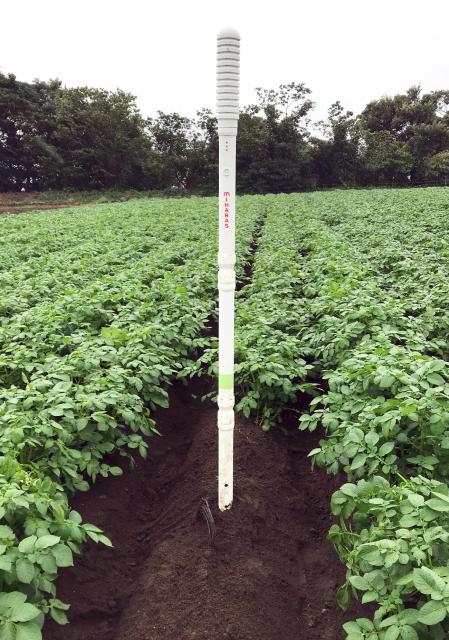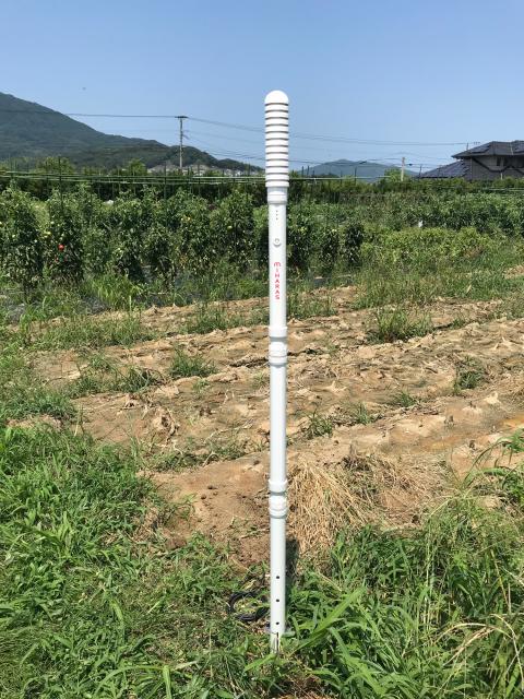 体積含水率、電気伝導度、地温を測定できるセンサー(ARP製)で、土壌の状態を遠隔で把握。土壌データは土壌水分による農機作業の実施判断、散水タイミングの最適化、害虫の発生環境の検証など作物の栽培時に利用されています。データを用いた後継者への指導、最適な栽培のためのデータも蓄積。水田用と同様、1回/1時間の周期で920MHz帯特定小電力無線通信、単二電池 3個(商用電源不要)で6カ月間稼働します。