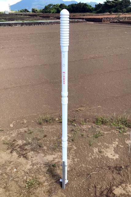 体積含水率、電気伝導度、地温を測定できるセンサー。単二電池 3個で6ヵ月間稼働。畑の土壌の状態をリモートで把握できます。