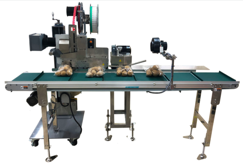 865AC型結束機と袋上部トリマー、コンベアを組み合わせた青果物向けの結束システムです。