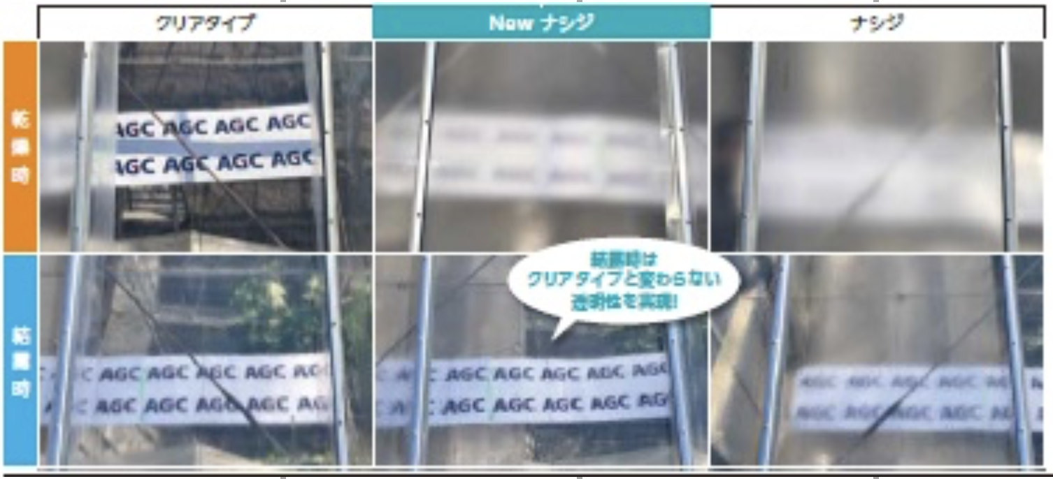 エフクリーン®は1988年に販売を開始し、おかげさまで32年を経過しました。発売時に展張したフィルムは、未だ健在で、多くの生産者に継続使用頂き好評を得ております。この度、夏の乾燥時は”ナシジ”に、冬の結露時は”クリア”になる画期的なフィルム『エフクリーン®New ナシジ』を発売します。夏は散乱光でヒトにも作物にも柔らかい光を届け、冬は直達光で作物に強い光を届けることができます。