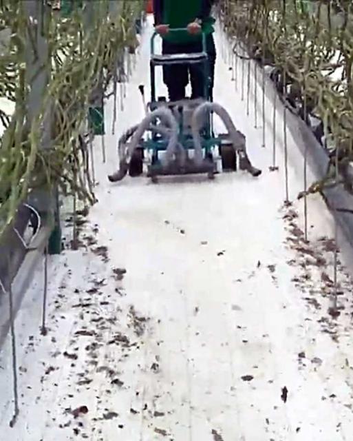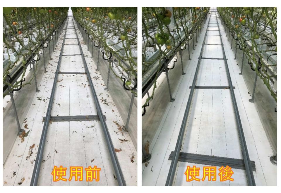 通路やレールの下などに落ちた花柄・ゴミ・残渣・果実などを風で吹き飛ばして掃除するブロワクリーナー。5カ所の噴出ノズルで前方向にゴミを飛ばし、左右2 か所の噴出ノズルでガター下の取り残したゴミを隣のレーンへ飛ばします。ハウスやダクトの仕様に合わせて、機体高さ・風口角度が調節可能。樹脂車輪のため、レールが無くてもご使用可能ですが、シートの傷みなど気になる場合は、オプションで専用車輪をご用意しています。