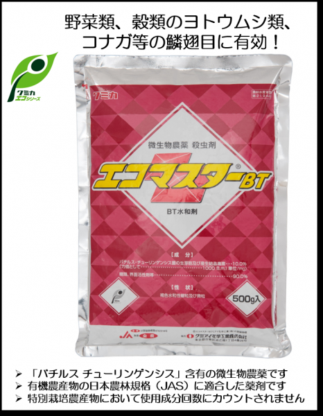 クミカの「エコ・クリーンシリーズ」は 、慣行栽培はもちろんのこと、微生物や天然由来の成分を用いた農薬であるため、化学農薬を使用しない「有機農産物栽培」における病害虫防除に使用することができます。また、使用できる農薬の成分数が限定される「特別栽培」においても、使用成分回数カウントゼロ!でご使用いただけます。「有機栽培」や「特別栽培」において病害虫の防除でお困りの方におすすめしています。