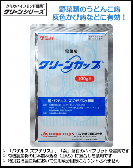 「クリーンカップ」は、特別栽培において使用成分回数にカウントされず、有機農産物の日本農林規格(JAS)に適合した薬剤です。「主に野菜類のうどんこ病・灰色かび病やトマト・ミニトマトの葉かび病・疫病及びきゅうりのべと病・褐斑病に有効です。収穫前日まで使用可能で、作物に対する汚れが少なく取扱いが簡易な水和剤です。
