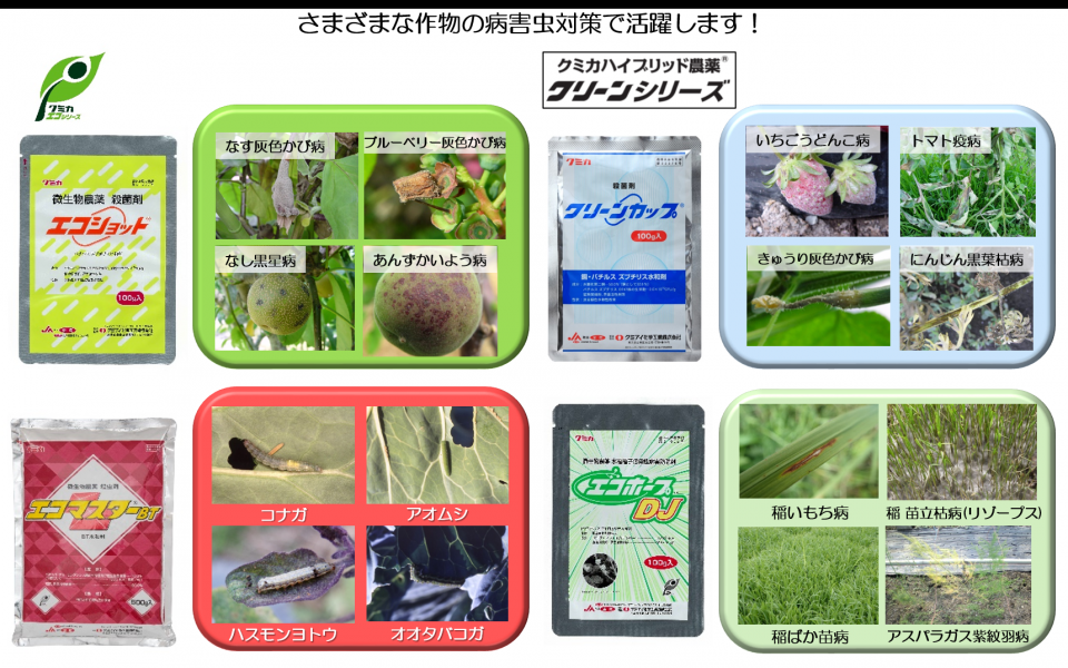 環境にやさしいクミカの「エコ・クリーンシリーズ」のご紹介! クミアイ化学工業では、微生物や天然由来の有効成分用いて有機農産物栽培、特別栽培に適した「エコシリーズ」、「クリーンシリーズ」を展開しています。
