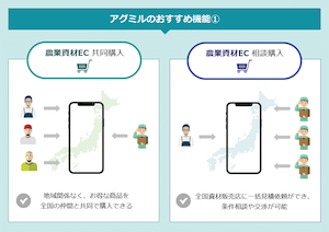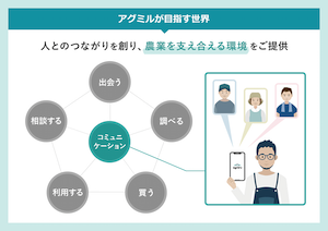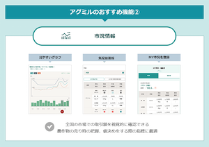 従来の資材比較・相談購入サービスに加え、農業に特化したニュース、農業エキスパートやメーカーに直接相談や質問ができ、様々な事例紹介ができるコミュニティ、毎日更新の市況情報、画像解析など多様なサービスを提供し続けている農業情報プラットフォームです。