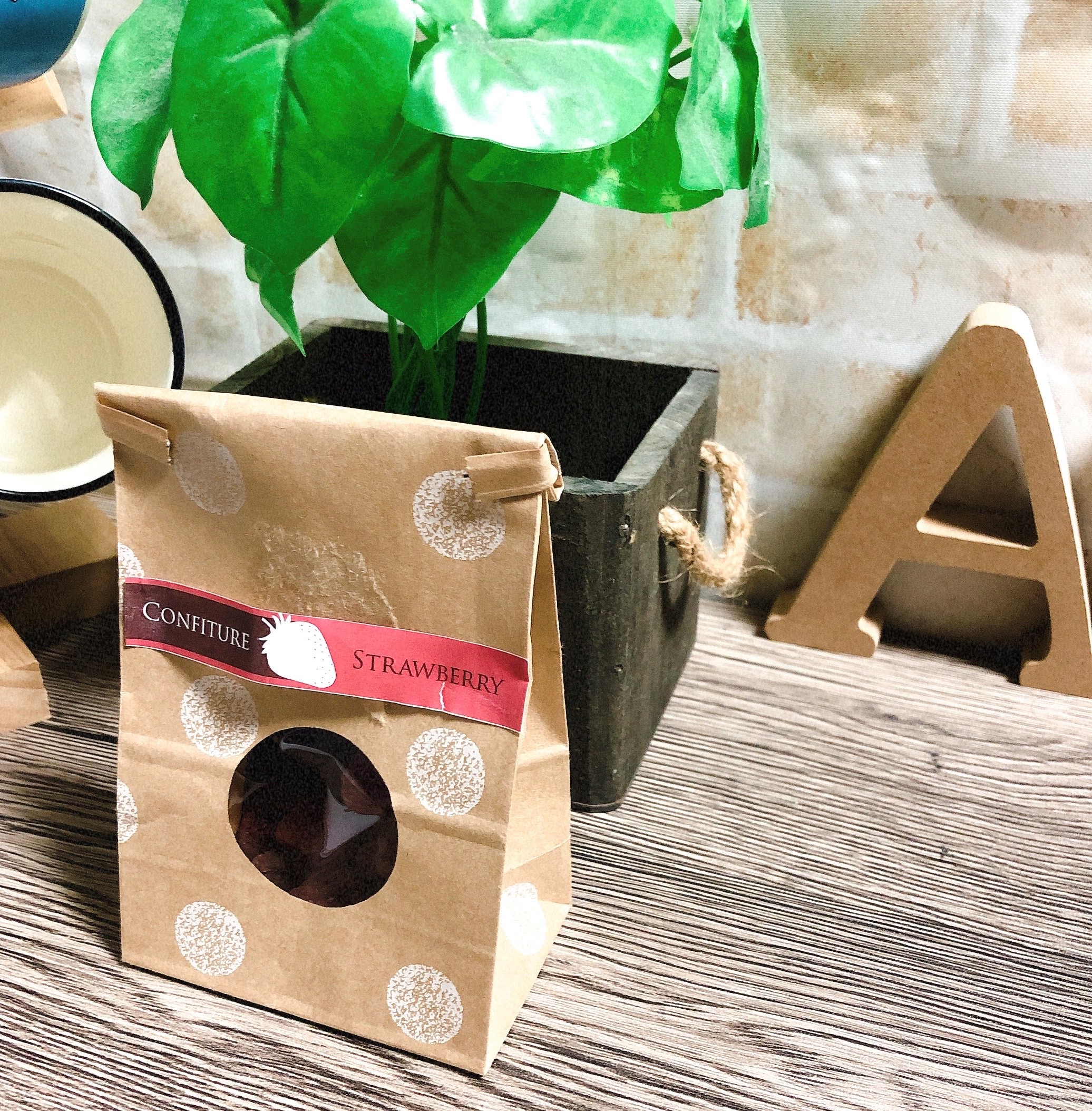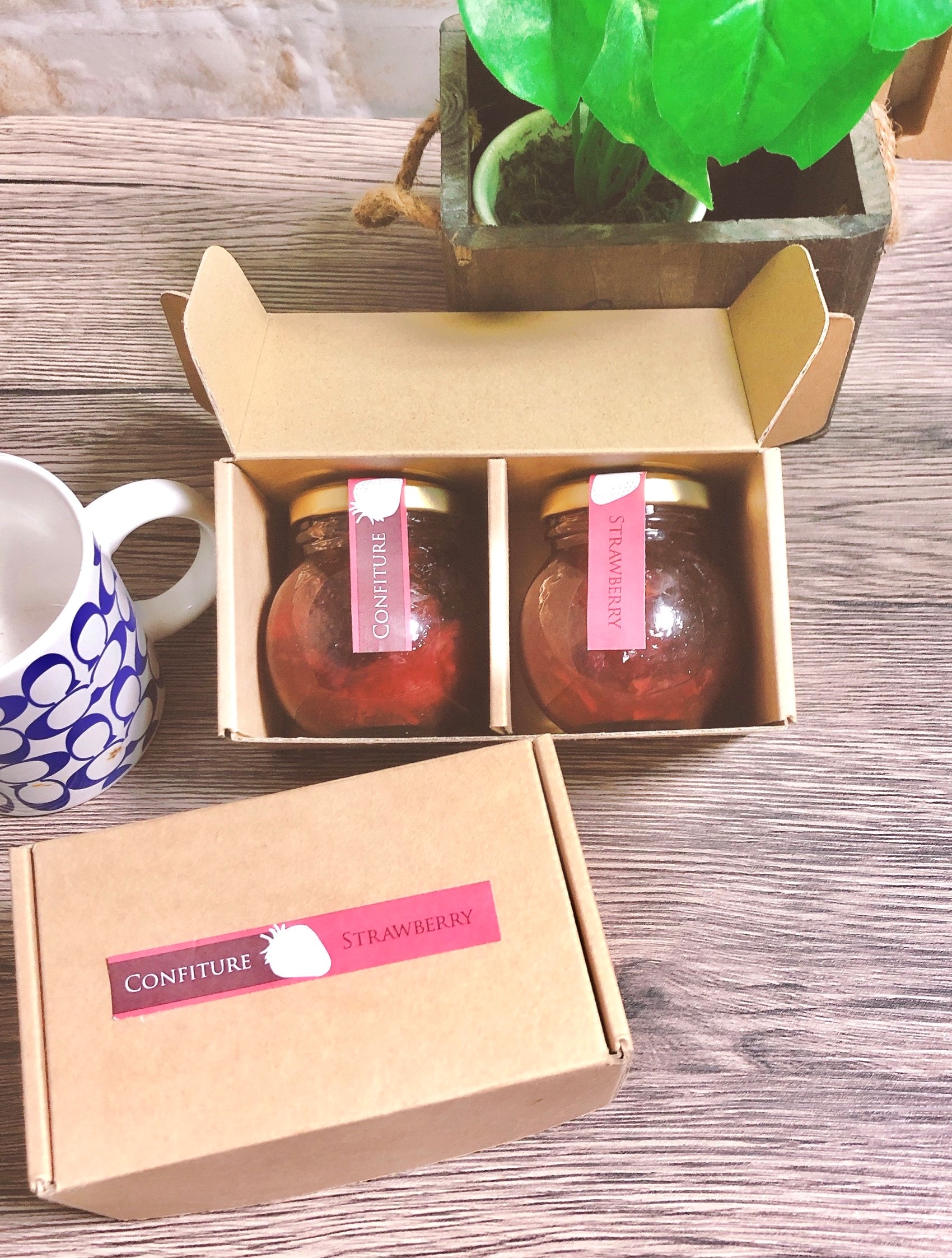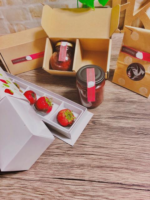 苺の加工品パッケージ、ジャム瓶、各底袋、チョコ用ギフト箱の使用例(苺農家様の場合)