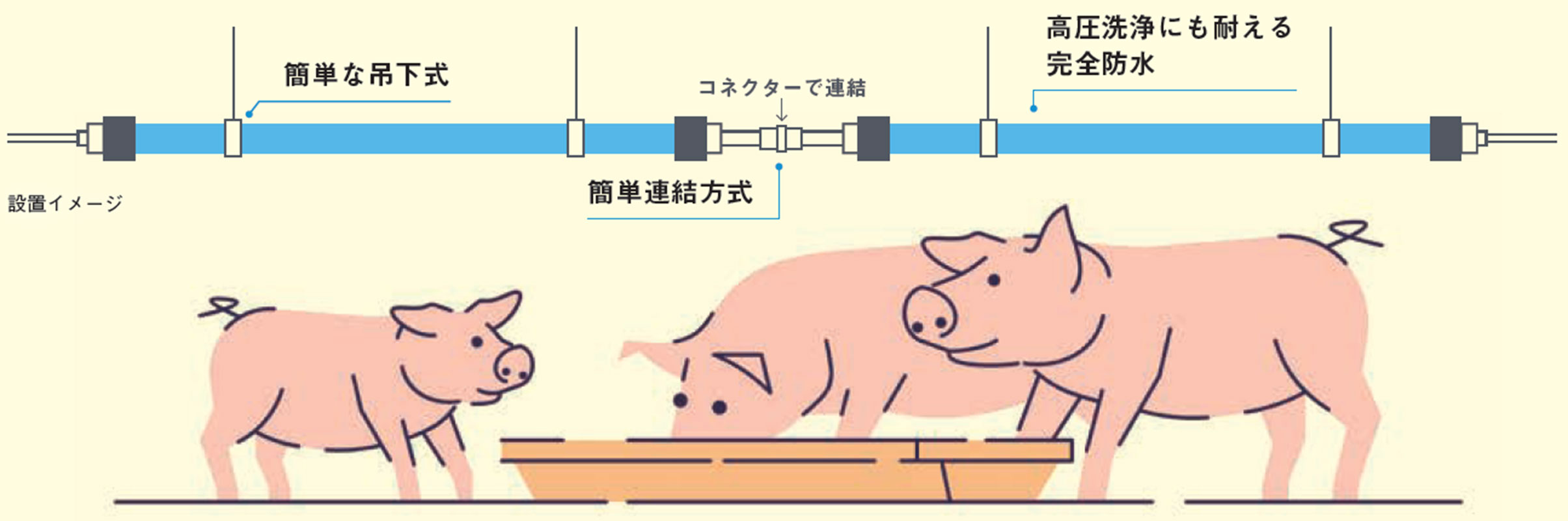 多くの養豚農家の課題である、母豚の発情管理と、産子数の安定。この課題についてホルモン製剤などに頼らず、繁殖成績を向上させる効果が期待されているのが、青色のLEDです。青色の波長により、エストロゲン(発情ホルモン)濃度を上昇させることが分かっており、排卵を促進することで、発情も安定します。生産効率が上がることはもちろん、受精への労力の低減、労働時間、母豚の飼育頭数や管理を低減させることも期待されます。植物の発芽促進に使用されている、同社青色LEDを、豚舎でも使用できるようアレンジしました。