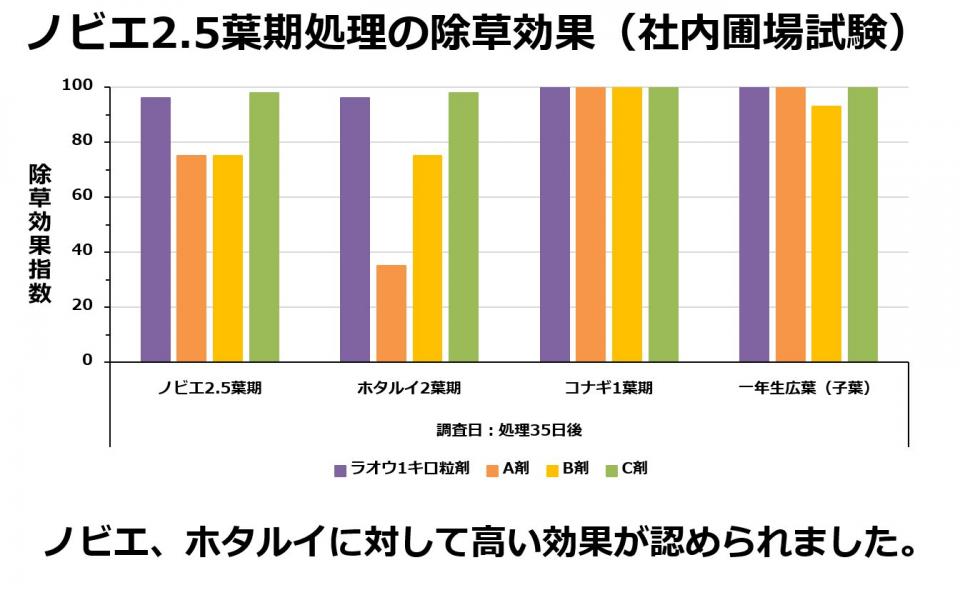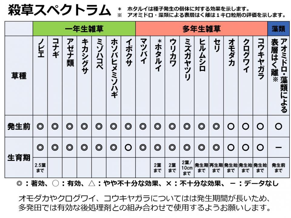 また、ベンスルフロンメチル配合により多年生難防除雑草に、フェノキサスルホン配合によりノビエに優れた除草効果と長期残効性を示します。