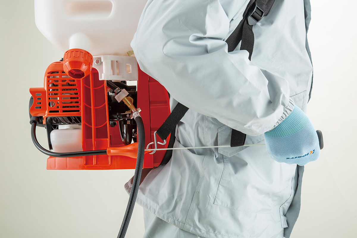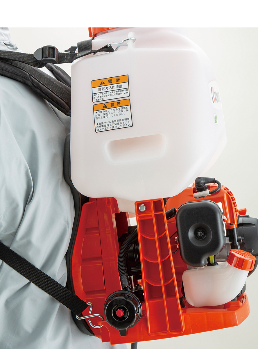背負いやすさ、薬液補充時の跳ね返り低減、スムーズな残液処理と、作業者への使いやすさを考えた渦流式ポンプの背負動噴。霧の豊かさとECOエンジンも好評です。