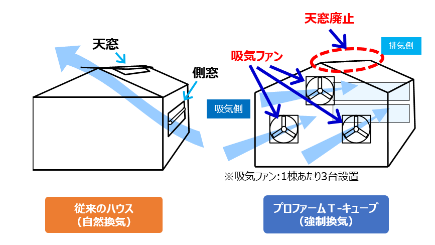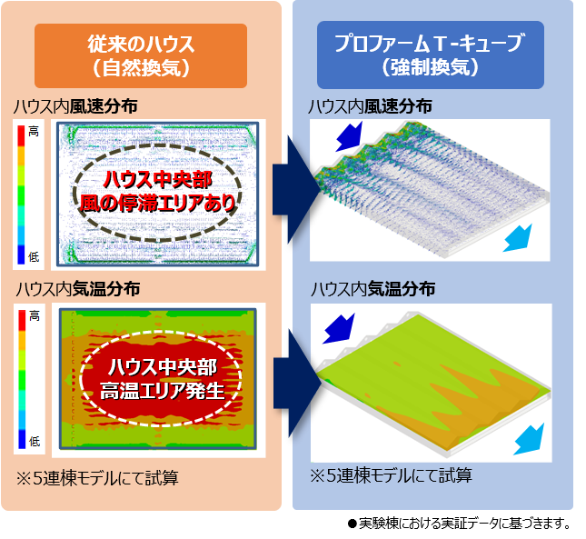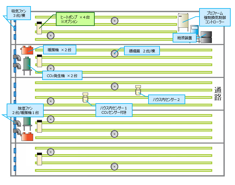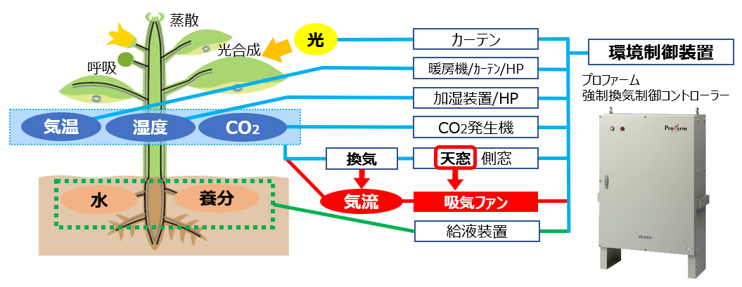 従来の天窓や側窓からの換気ではなく吸気型の換気扇を導入し、外の天候に左右されない換気効率を実現しました。気流解析と実証試験データに基づいた設備配置で、気流によってハウス内の空気の停滞やムラを軽減、高温抑制効果の向上が期待できます。天窓をなくしたことで影ができにくくなっており、植物生長に重要な光・気温・湿度・CO₂・水・養分・風をプロファームコントローラーが制御し、安心かつ安定した栽培環境を提供します。