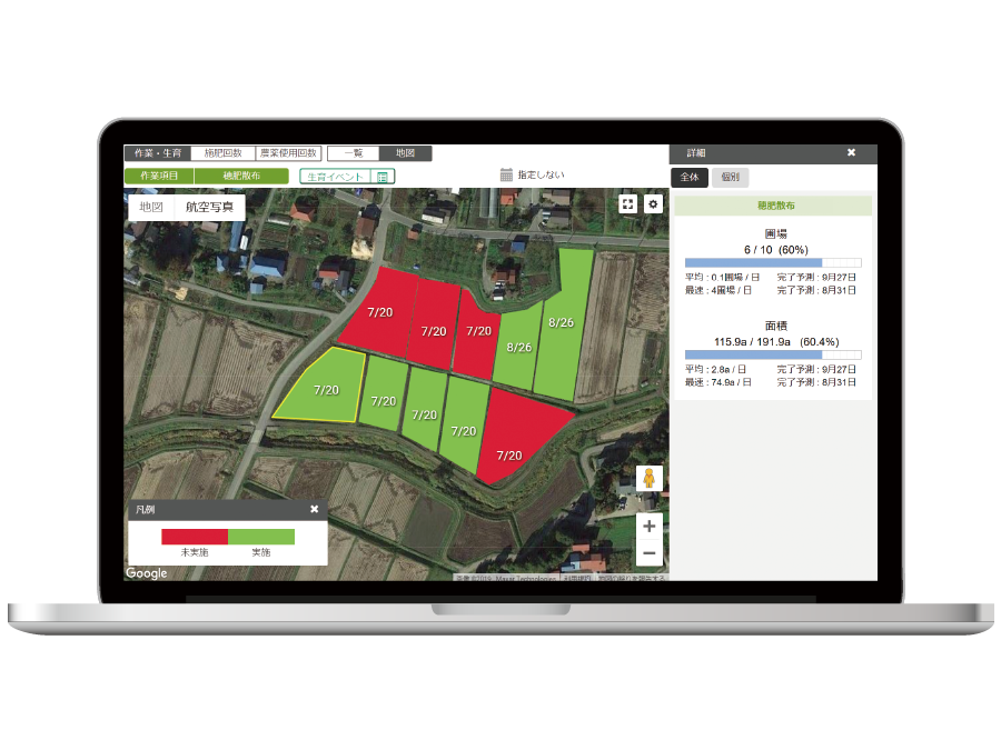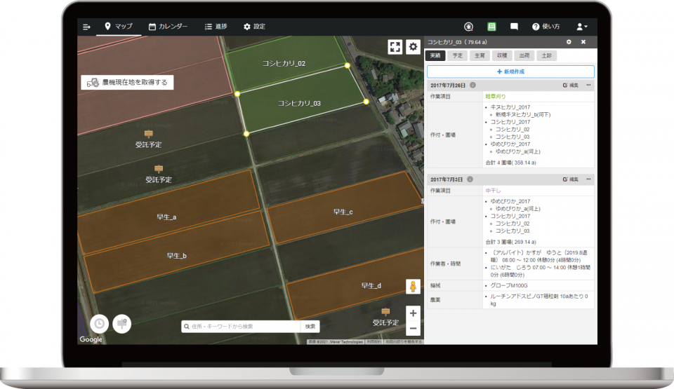 日々の営農記録をデータとして蓄積。農作業の進捗や計画を、組織内で共有できます。