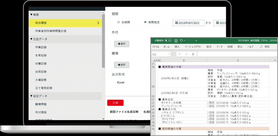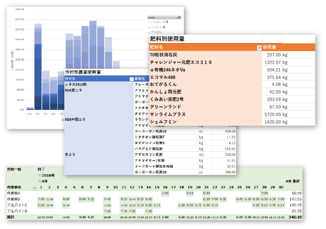 アグリノートに記録した内容は、カレンダーや作業進捗、タイムラインや収支などさまざまな形で閲覧・管理していただけます。作業記録以外にも作物の生育状況や収穫・出荷まですべて記録でき、農薬・肥料の使用履歴や使用量を自動で計算したり、作業の進行状況に沿って圃場マップを色分けして表示するなど、あらゆる形で確認できます。記録内容はCSV形式またはExcel形式で出力できるので、書類作成などにもご活用いただけます。