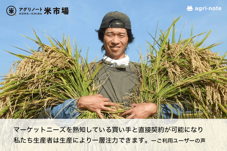 アグリノート米市場は、 専用のアプリケーションを使用して、米生産者と米卸業者・実需家がインターネット上で米の売買取引をする、新しいお米の市場です。次に収穫期を迎えるお米を取引対象とした事前契約を原則に、栽培開始前からの事前契約が容易に可能な場を提供することで、米生産者の計画生産・経営の安定化を支援するとともに、米卸業者の調達の安定化に貢献します。