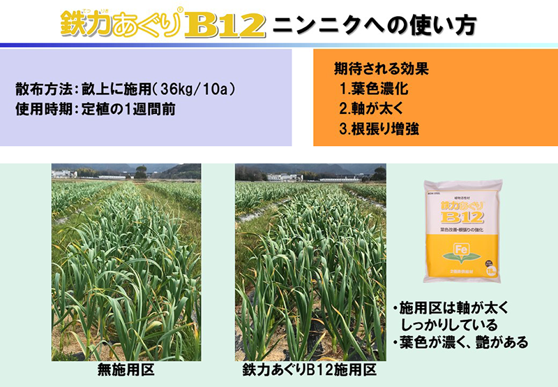 植物の鉄吸収メカニズムに適した固体資材で、作物の鉄分不足を解決します。期待できる効果は、葉色改善による光合成促進、根張り強化による活着促進や生育促進、代謝正常化による生育維持。「B10」は1~3mmの顆粒で培土などにも混合しやすく生育期間が短い葉菜類や育苗などに。「B12」は3~5mmの粒で撒きやすく生育期間が長い果菜類や果樹などに。使い続けても土壌蓄積は起こりません。