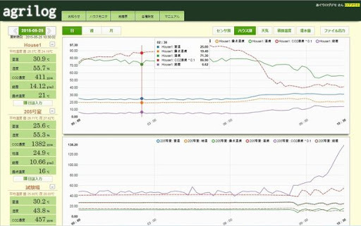 温度・湿度・CO2濃度等をPC・スマホから確認できる「あぐりログ」。「生育ナビ」と併用により、生育と環境の観察が可能です。