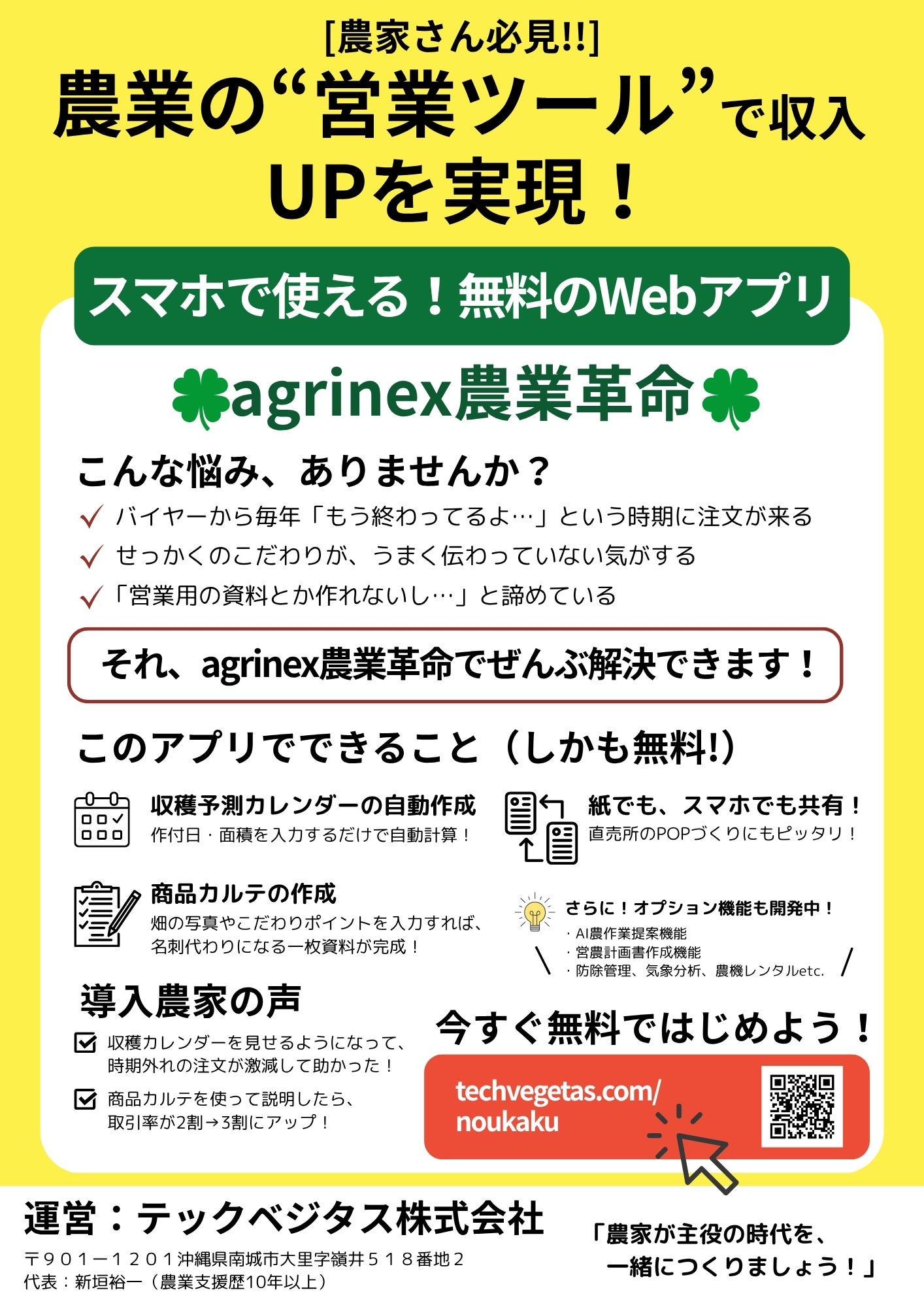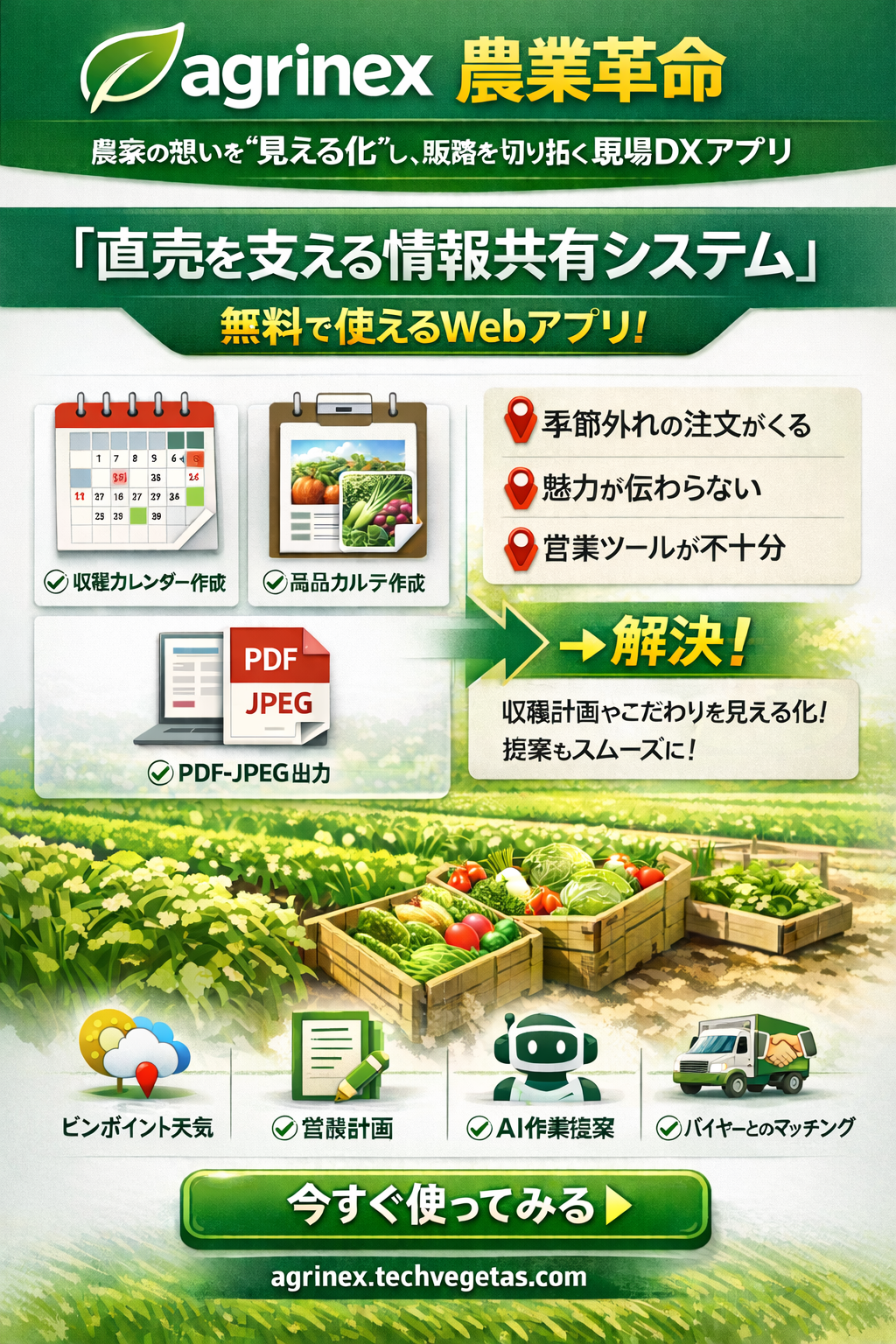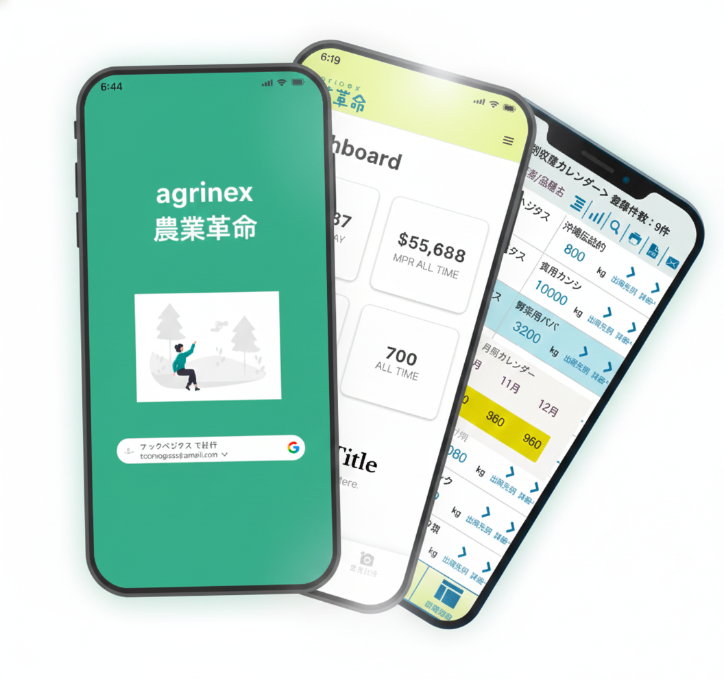 agrinex農業革命は、生産者のアナログな情報をデジタル化し、収穫カレンダーや収穫予測、商品カルテなどの機能があり農業に関する管理ができるサービスです。