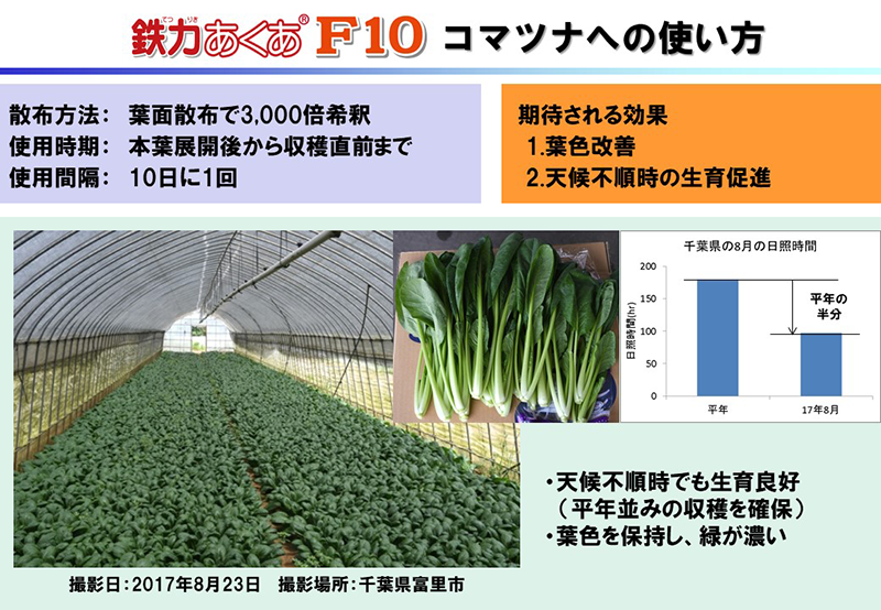 植物の鉄吸収メカニズムに適した液体資材。鉄分不足を解決します。期待できる効果は、葉色改善による光合成促進、根張り強化による活着促進や生育促進、代謝正常化による生育維持。NPKが含まれていないので肥料設計はそのまま。2価鉄配合で吸収性抜群。高濃度の鉄分配合で用途によって2000~1万に希釈するので経済的です。潅水・養液混合、葉面散布、水耕栽培、台風や集中豪雨などでストレスを受けた植物全般にどうぞ。