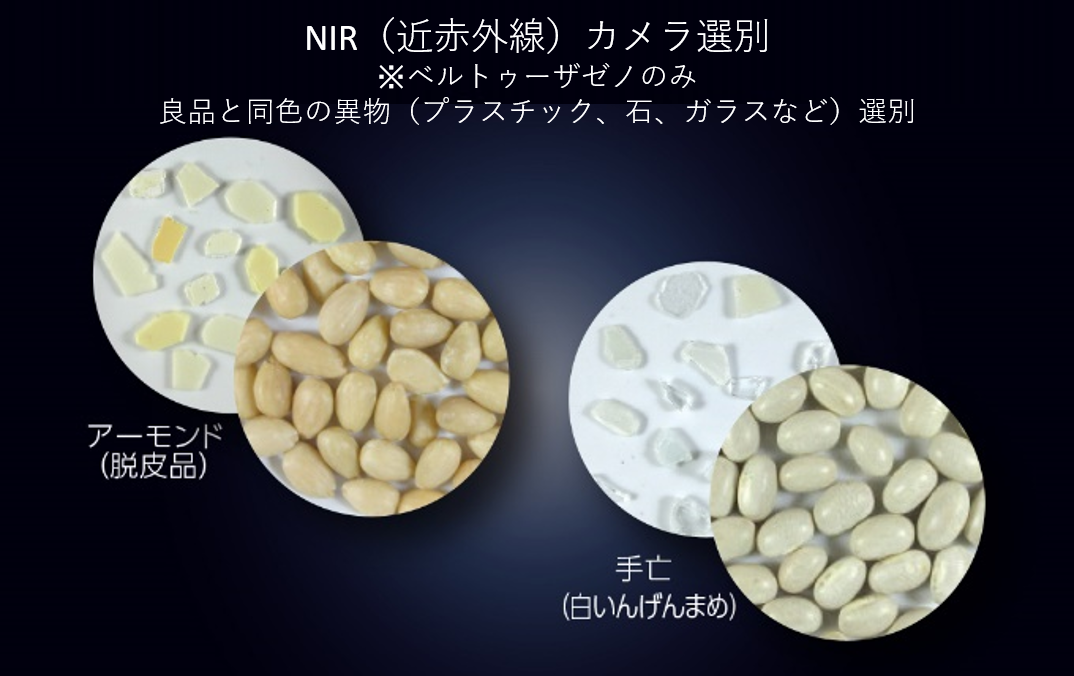 ベルトコンベアで幅広く均一に原料を搬送。色・形の違いだけでなく、良品と同色の異物(プラスチック、石、ガラスなど)を選別可能。※NIR搭載はベルトゥーザゼノのみ