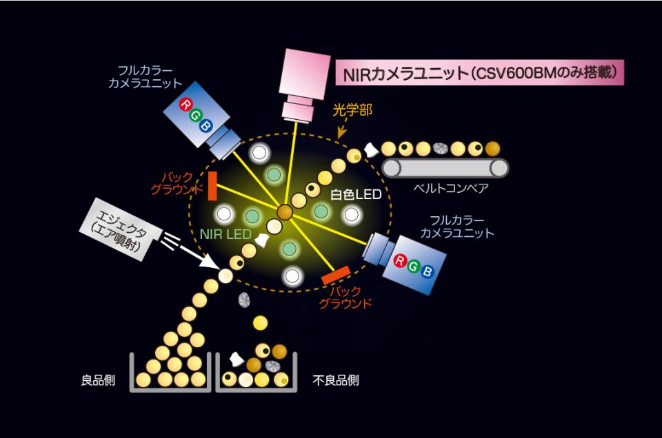 色彩選別機能と形状選別機能を搭載し、多彩な選別が可能な光選別機