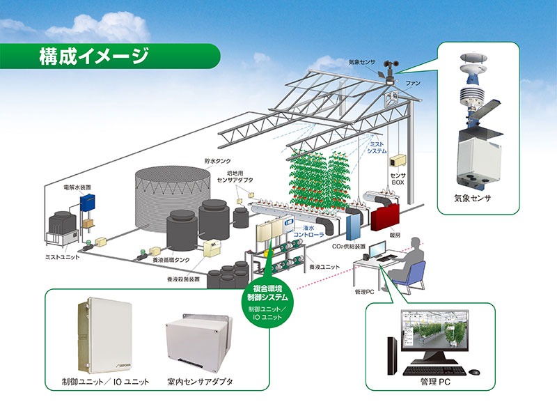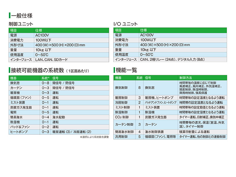 ●制御ユニット(本体)1台に、センサとIOユニットを追加するだけで最大10区画(320点出力)まで増設可能。異なる作物や生育段階に合わせ、区画ごとに異なった制御設定で、複数区画を一括管理できます。
