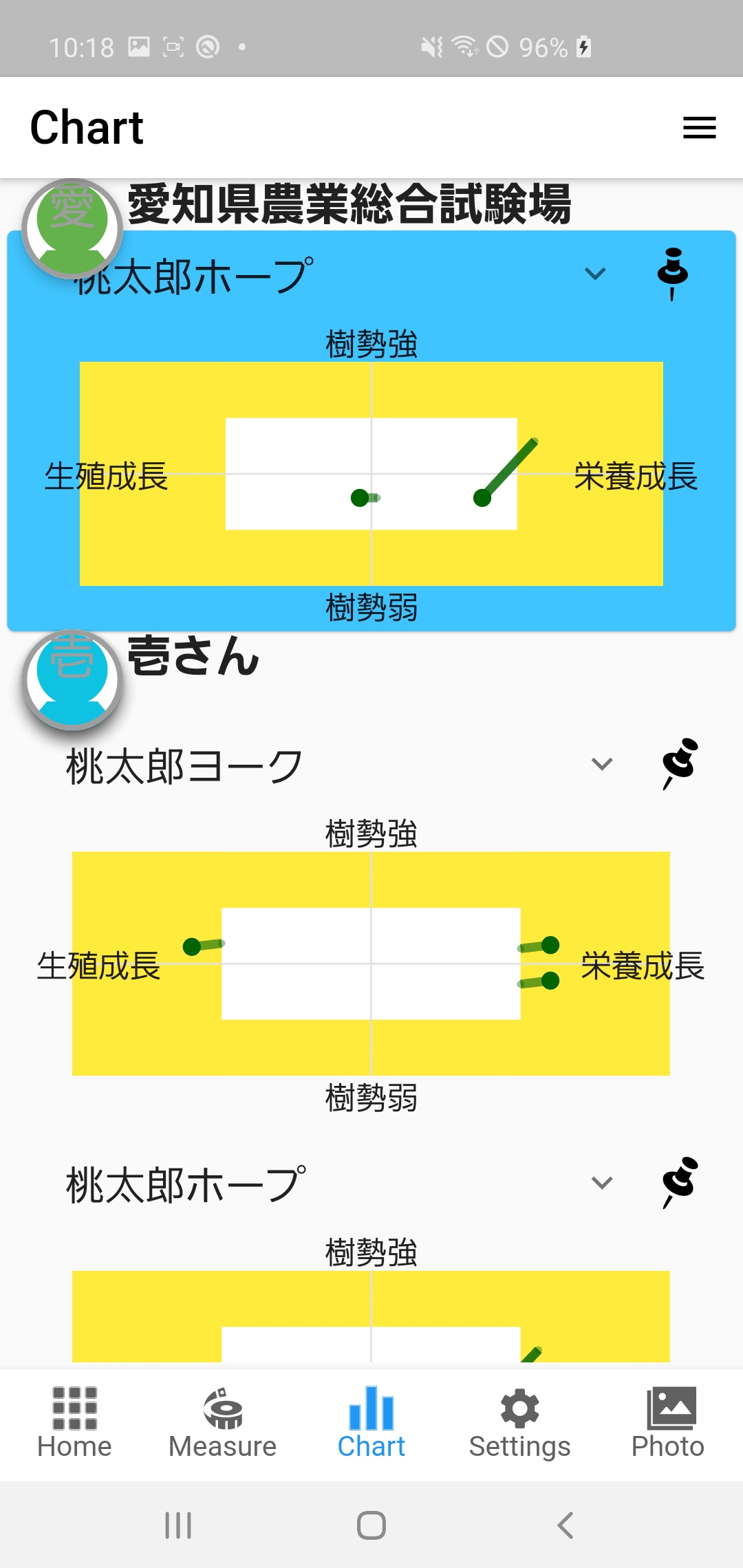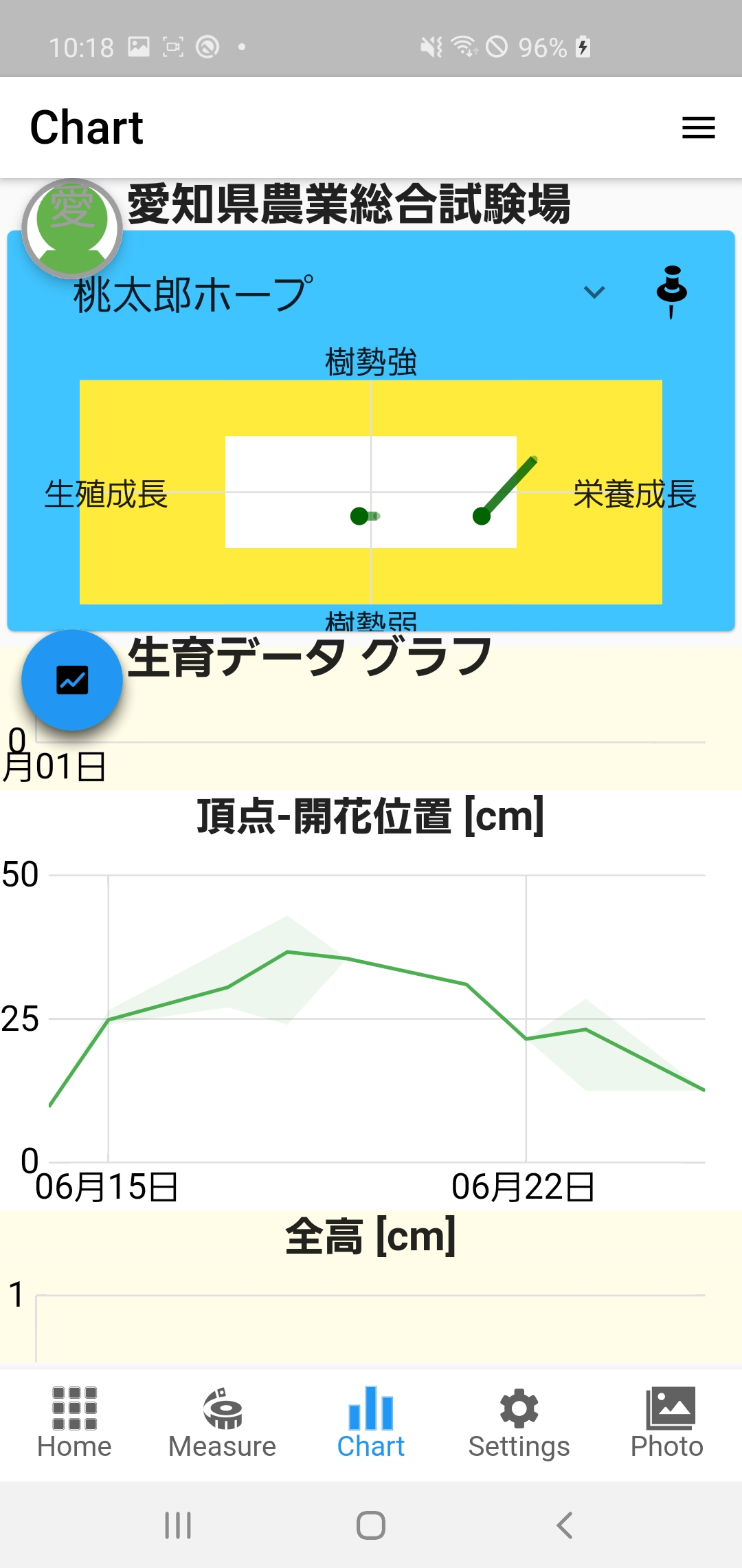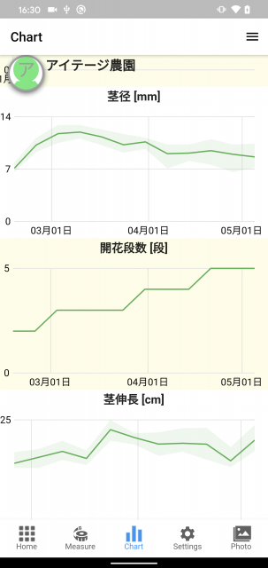 目指すは「トマトの生育状況をスマホで見える化」。トマトの測定項目をスマホで撮影し、画像解析により頂点・開花位置長、茎径、茎伸長、葉幅、着果数などの成長量を数値化。葉面積推定、光合成活性量推定も現在開発中です。測定データや撮影画像はクラウドに成長履歴として残るため、過去の生育状況との比較のほか、別棟ハウス、他生産者とも比較が可能。また、グラフやバランスチャートで生育状況を確認することができます。