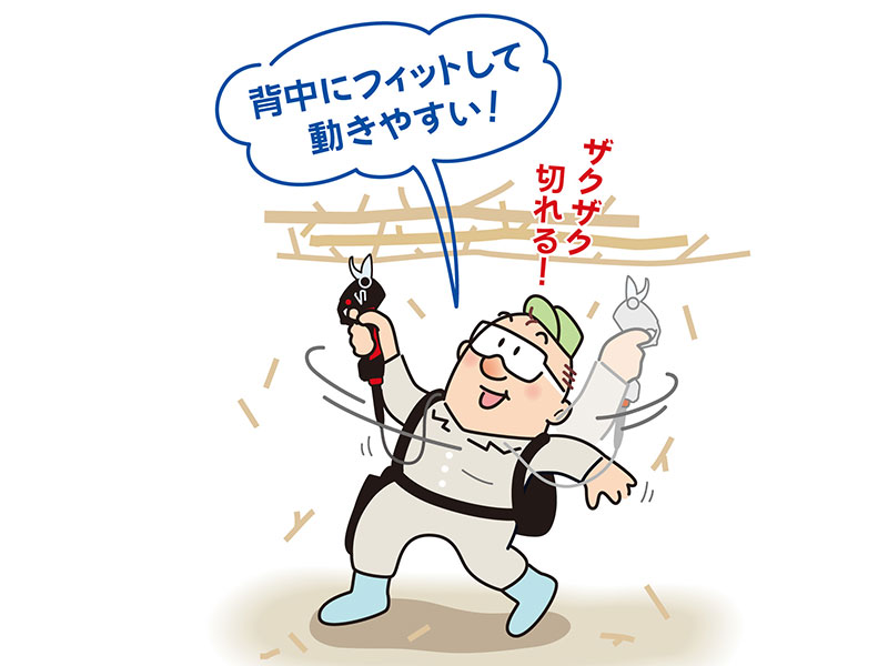 梨・桃・柿・ブドウ・梅といった果樹の剪定は、腱鞘炎の恐れや手首や腕の疲れなど、身体に大きな負担がかかります。そんな剪定作業を楽にしてくれるのが充電式の剪定はさみ。マックスの充電剪定はさみは他社とは一味違います。両刃可動により、小型軽量の本体からは想像がつかないほどのハイパワーと、日本製の刃が実現するキレイな切り口が自慢です。日本人の手に合わせて設計された握りやすいグリップや、リュックサックタイプによって背中にフィットして動きやすい設計など、現場での使いやすさを第一に考えた商品です。