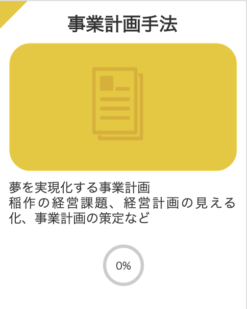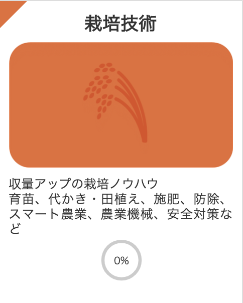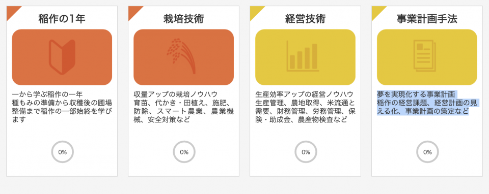 「稲作の1年」「栽培技術」「経営技術」「事業計画手法」の4分野の中から、ご自身の気になる講義を選んで視聴可能です。