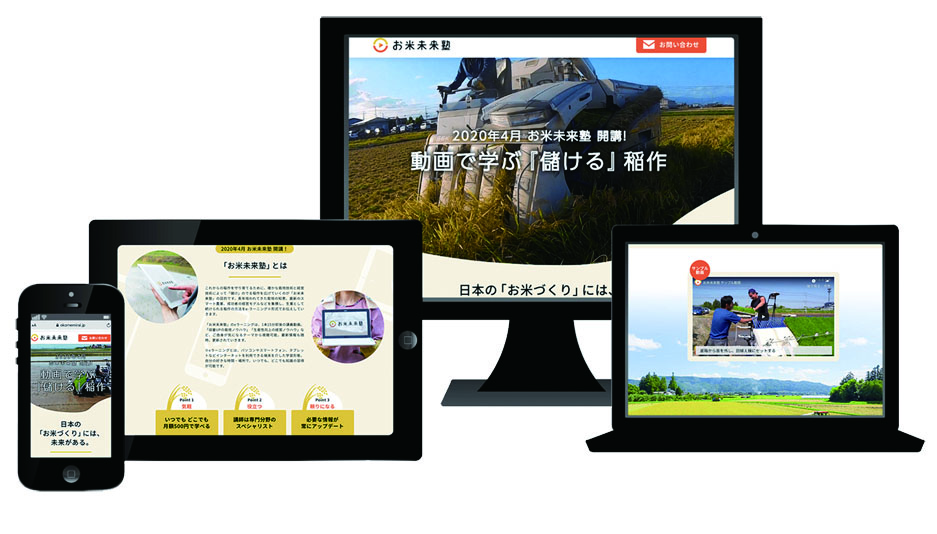 <“動画”で“体系的”に学ぶ稲作技術> 月額500円で、いつでもどこでも好きな時間に手軽に学べます。 稲作に特化したeラーニング動画サービスの『お米未来塾』は、 稲作の未来をつくり、育てるための学習コミュニティです。