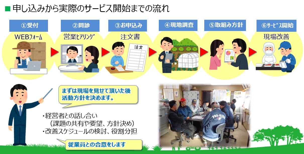 改善活動を経営体の従業員全員で進められるよう、トヨタの改善スタッフが訪問し、改善の仕組みづくりと人材育成をサポートします。