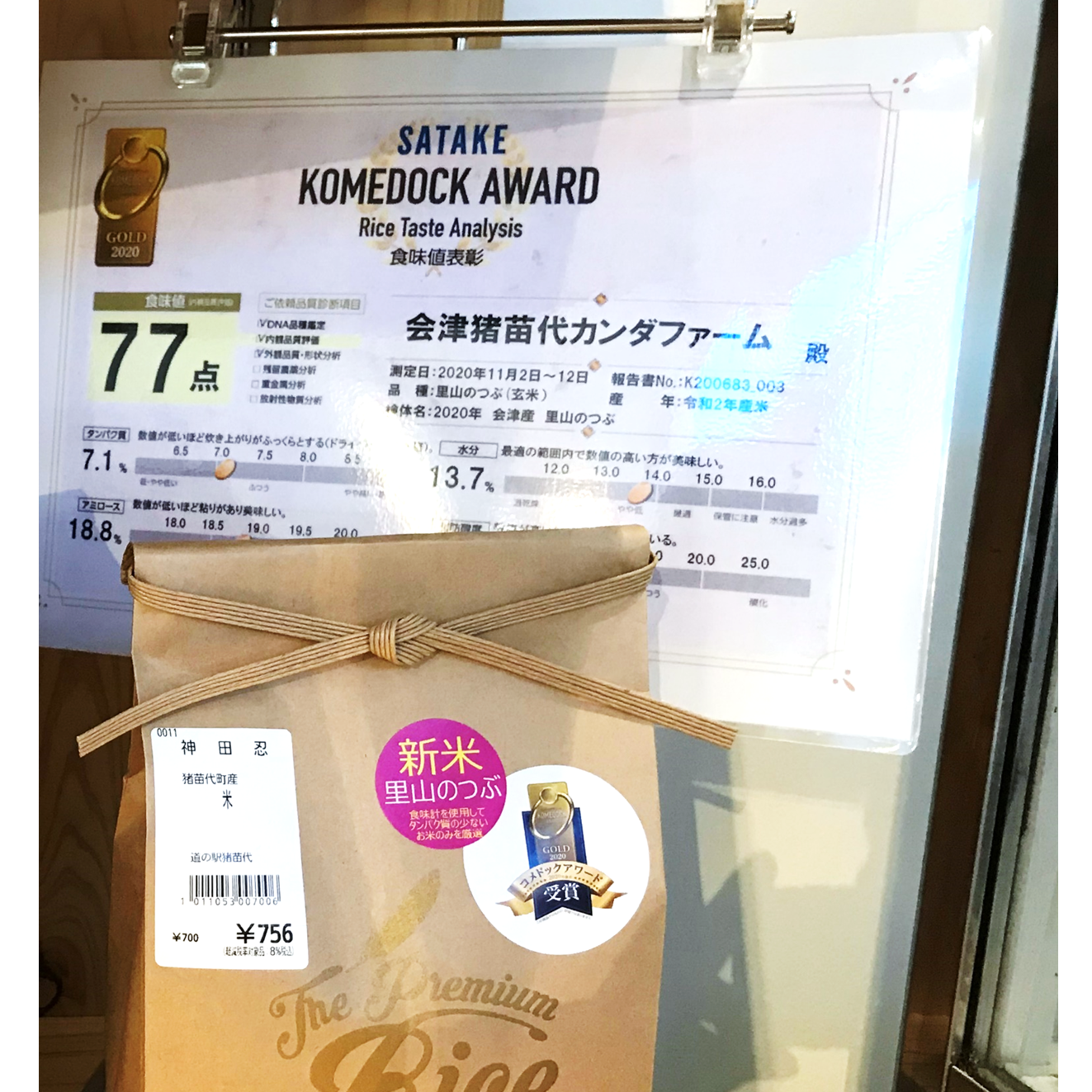 今回、コメドックアワードで金賞を受賞しましたので、米袋にアワードを使ったオリジナルステッカーを貼って販売しています。また、コメドックアワードの表彰状も道の駅でそのままPOPとして活用しています。