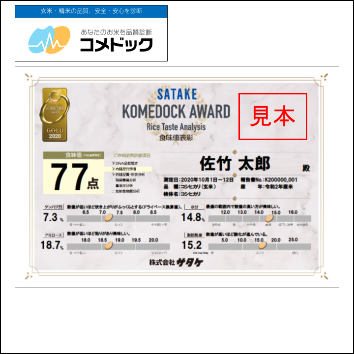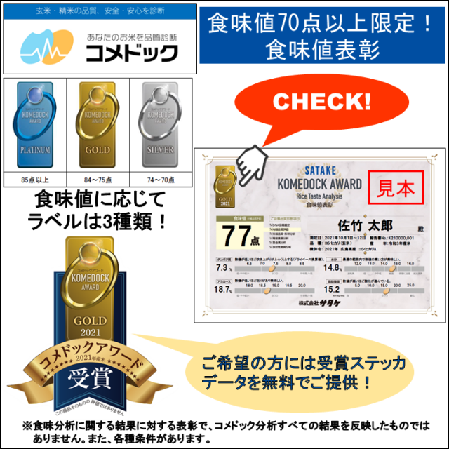 コメドックの食味分析の結果が70点以上の方限定で、食味値表彰を行っています。点数に応じて、プラチナ・ゴールド・シルバーのラベルが付与されます。