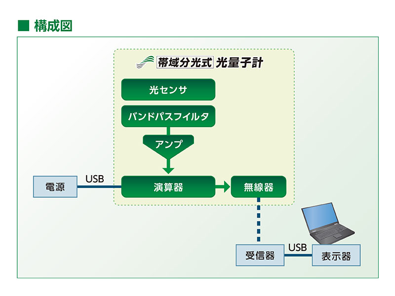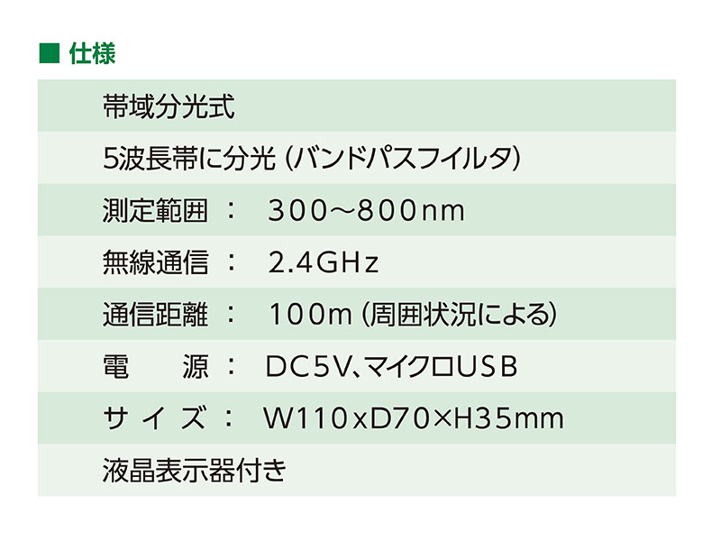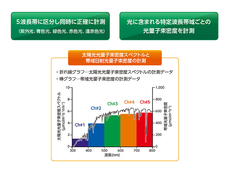 光を特定波長帯域ごとに分光し、光量子束密度を計測。5波長帯(紫外光、青色光、緑色光、赤色光、遠赤外光)に区分し、同時に正確に計測します。